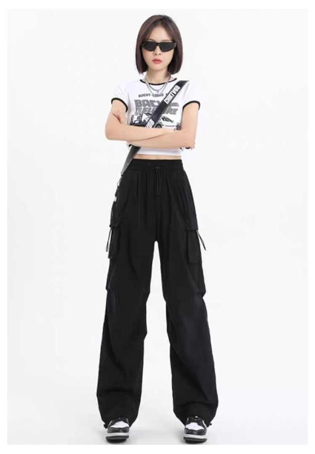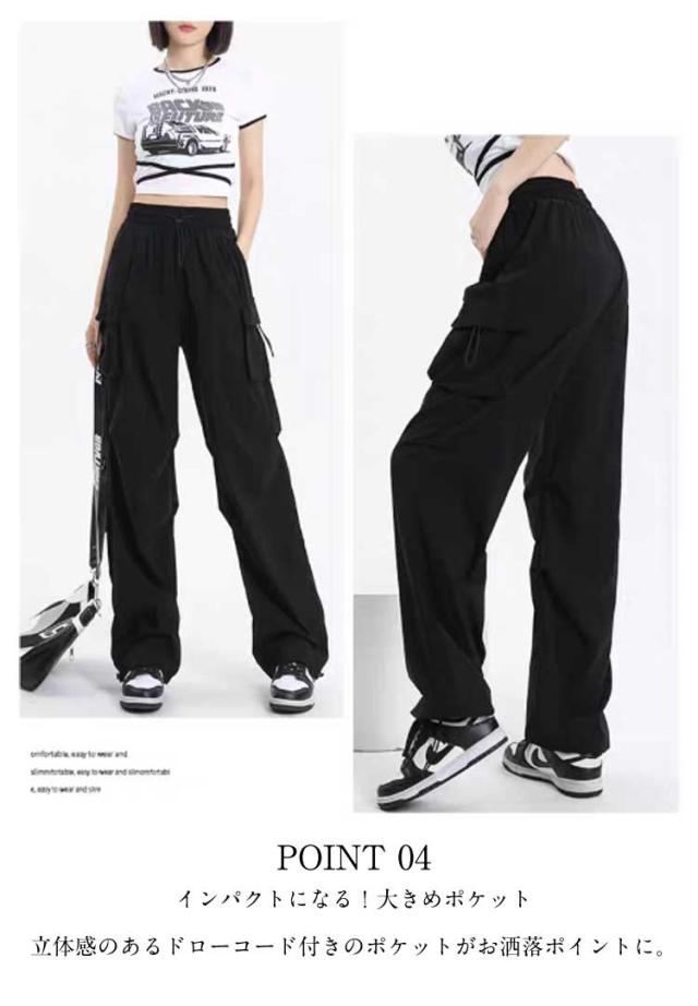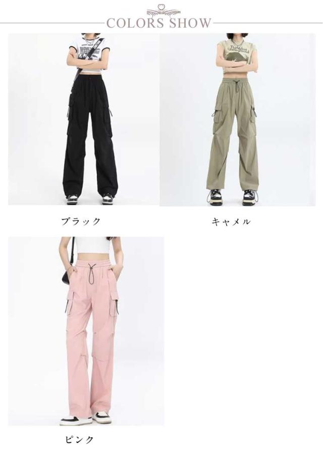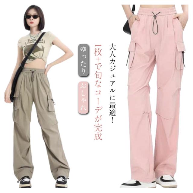 ボトムス レディース かわいい ズボン ルーズ おしゃれ 黒 薄手 楽 サイドポケット メンズライク シンプル カーゴパンツ 春 動きやすい 女性用 ワイド 秋 無地 10分丈 ゆったり スナップボタン ウエストゴム ドローコード 調節 作業着 カジュアル