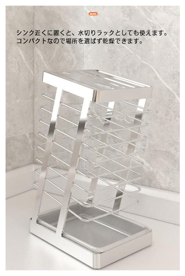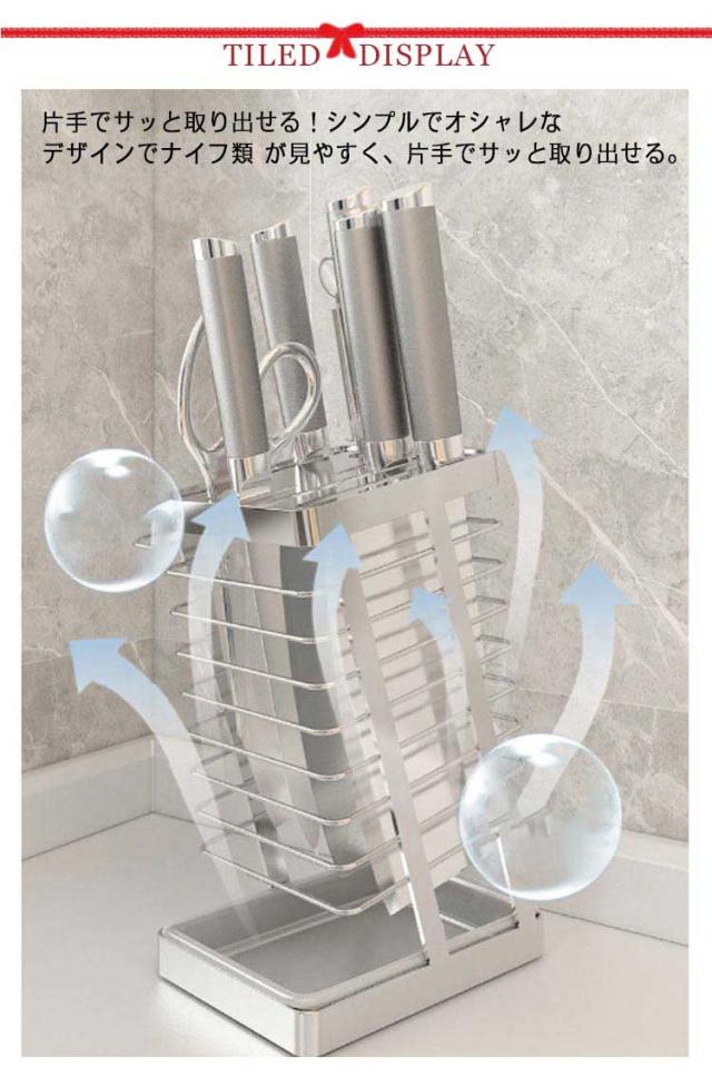 | 毎日使う包丁をすっきり収納できるスタンドです。 片手でサッと取り出せる!シンプルでオシャレなデザインでナイフ類 が見やすく、片手でサッと取り出せる。 清潔を保てるステンレス製。どんなキッチンにも馴染み、お手入れのしやすいデザインです。 包丁やナイフ、ハサミを入れる場所が7個あるので、様々な種類の包丁を収納できます。 シンク近くに置くと、水切りラックとしても使えます。コンパクトなので場所を選ばず乾燥できます。 前後左右と上下、すべてが解放していて通気性バツグンです。包丁同士がくっつかないので乾燥も早く清潔です。 トレイは取り外して丸洗いできます。いつも清潔に保つことができます。 | |