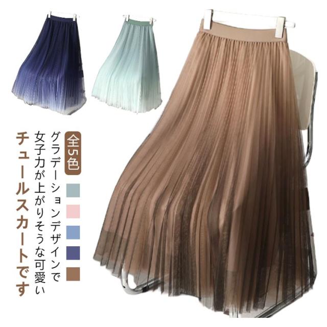 プリーツスカート チュールスカート グラデーション フレアスカート Aライン ロングスカート フェミニン お呼ばれ ハイウェスト ウェストゴム ゆったり かわいい ロング エレガント おしゃれ 着?せ 裏地付き S M グラデーション XL