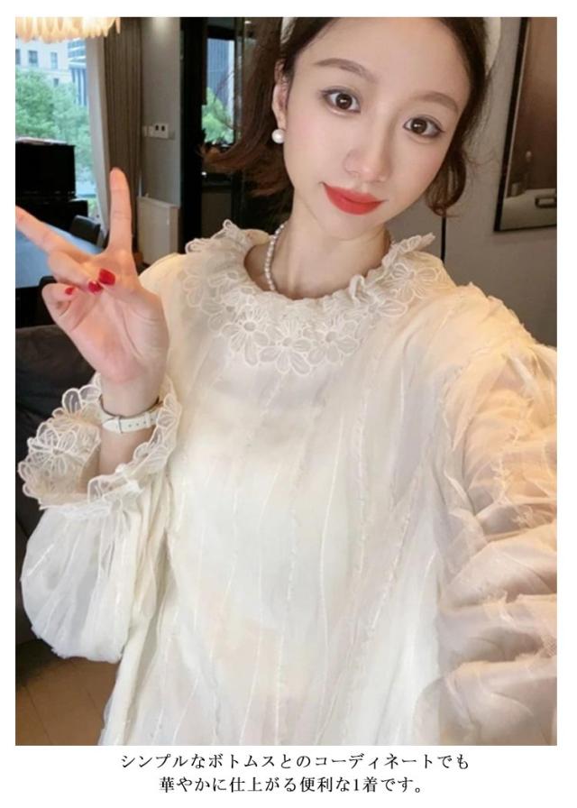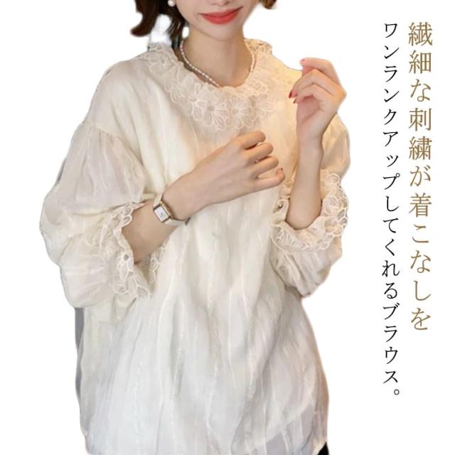 パフスリーブ ボリューム袖 チュニック 大人可愛い レース ブラウス 刺繍チュニック 大きいサイズ レース襟 ぽわん袖 トップス 長袖 ゆったり 二の腕カバー 体型カバー 透け感可愛い 春 秋 通勤 オフィス 上品
