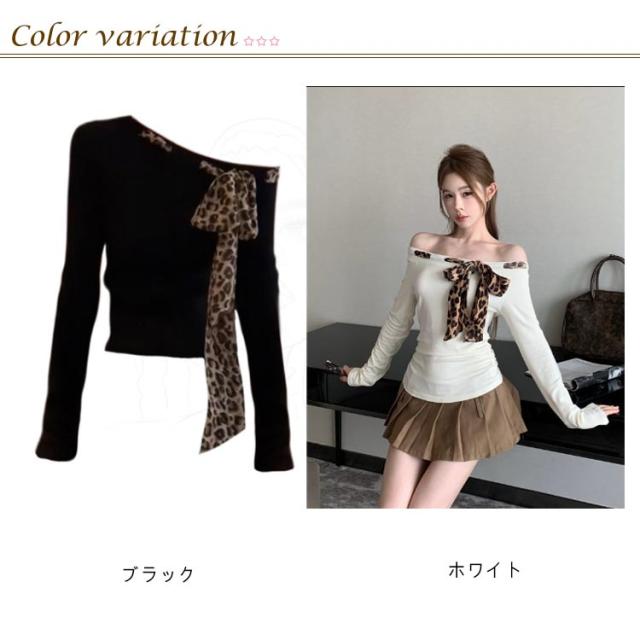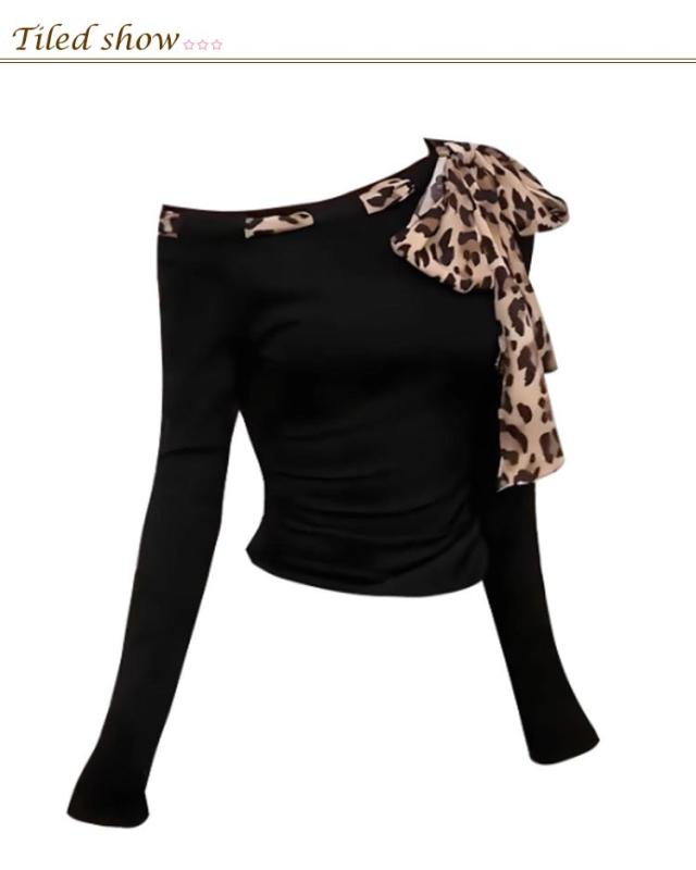 Tシャツ 長袖 レオパード 肩見せ レディース トップス 長袖Tシャツ 肩出し オフショルダー リボン オフショルダー フェミニン かわいい 細身 スリム アメカジ セクシー 韓国ファション 春秋 S M L XL