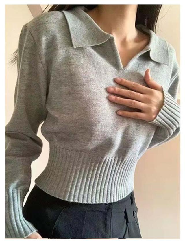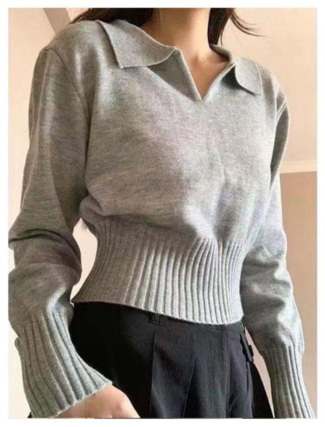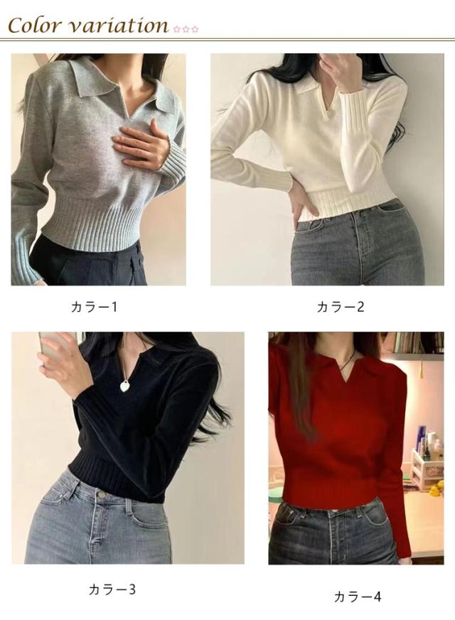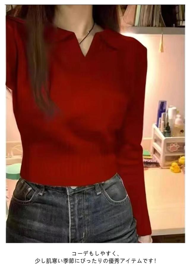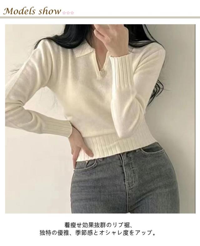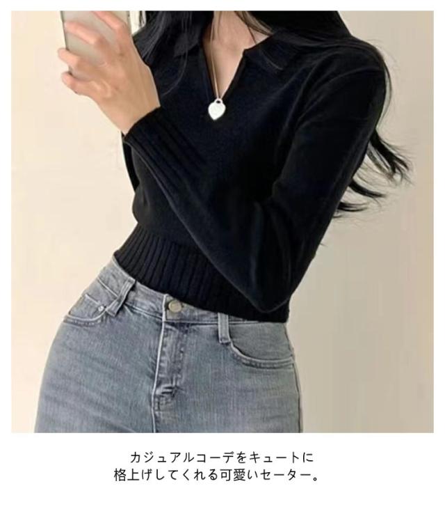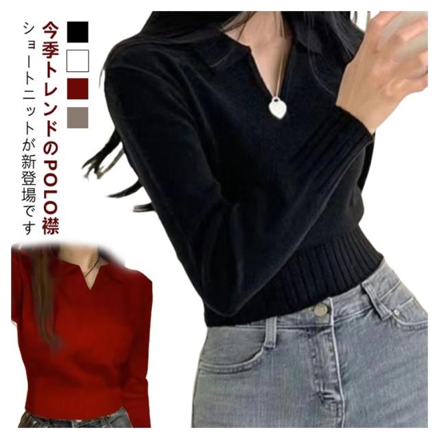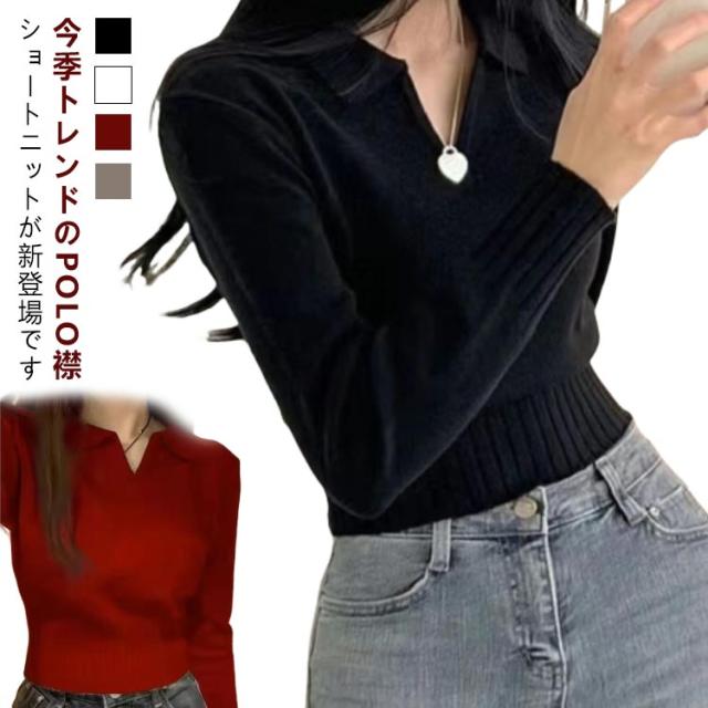 ポロ ニットトップス かわいい ポロ セーター トップス 春 Vネック ショート 秋 長袖 おしゃれ 可愛い リブ 韓国ファション レディース 着やせ S M L