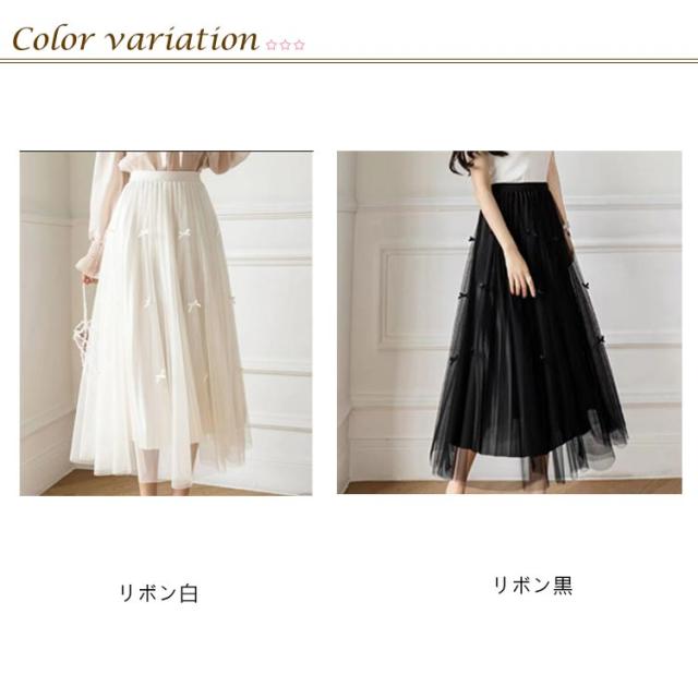 Aラインスカート フレアスカート ロング リボン ボリューム チュールスカート プリーツスカート フェミニン かわいい ウェストゴム リボン おしゃれ 体型カバー 春 秋
