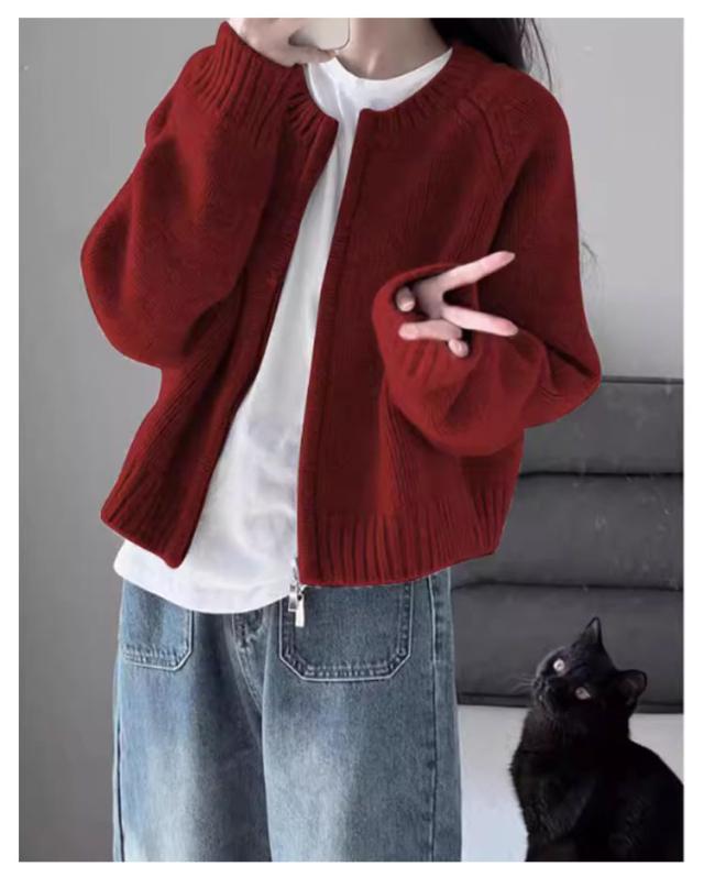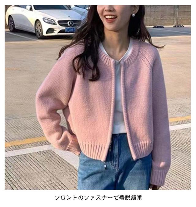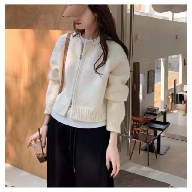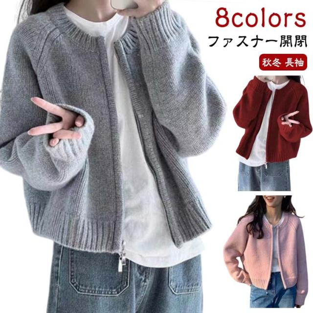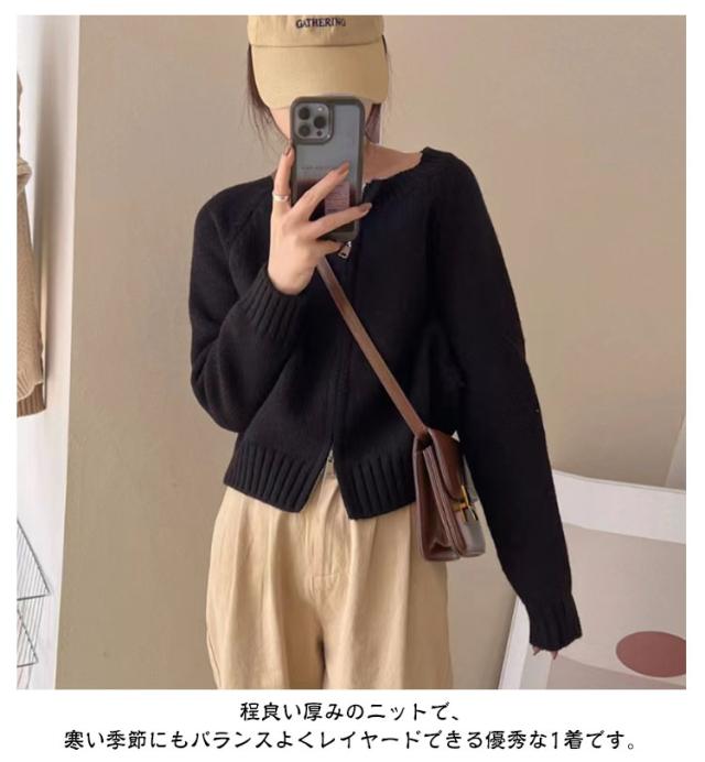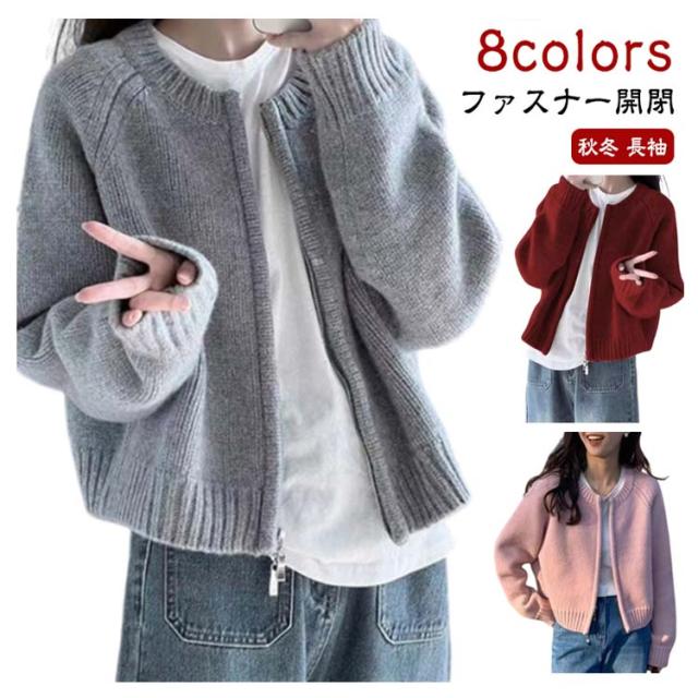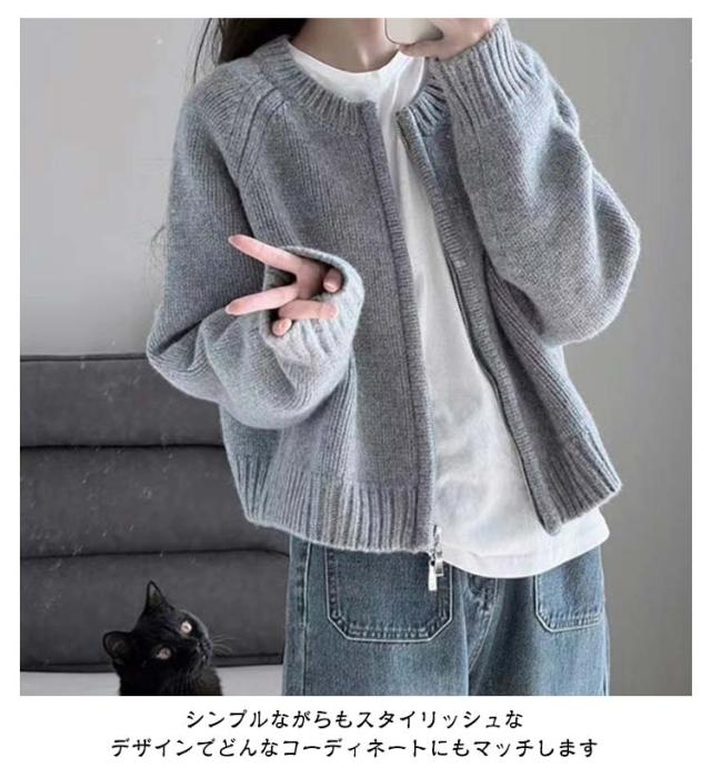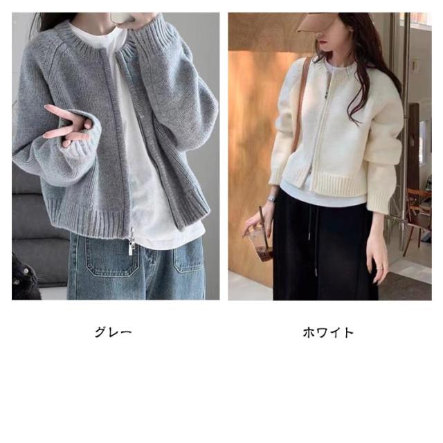 アウター ニットセーター レディース ニット 厚手 ラウンドネック ファスナー 長袖 クルーネック トップス ダブルジップ カーディガン ショート丈 カジュアル 黒 グレー 白 秋冬 無地 シンプル カジュアル