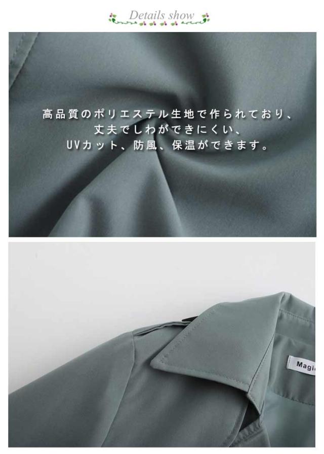 | デイリーからビジネスまで、様々なシーンで活躍するスプリングコートです。 高品質のポリエステル生地で作られており、丈夫でしわができにくい、UVカット、防風、保温ができます。 女性らしい襟のデザインが人気のポイント。 シンプルな無地のデザインなので通勤やオフィス、ビジネスコートにもおすすめです。 | |