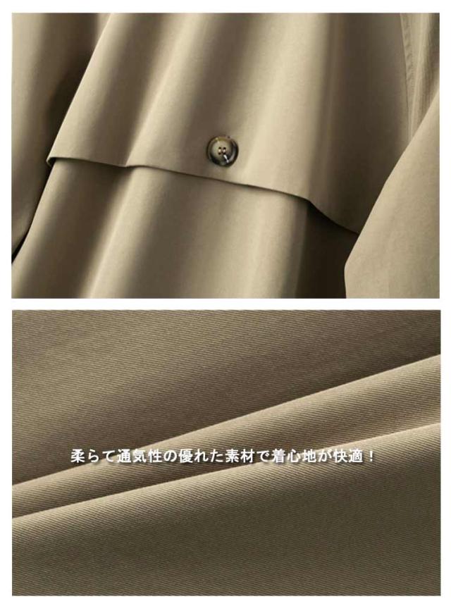 | ミドル丈で薄手なトレンチコートが登場。 柔らて通気性の優れた素材で着心地が快適! たっぷりめにとった身幅、軽い着心地、様々な体形にフィットしてすっきりとしたAラインシルエット。 大きなポケットも付いており、機能性も兼ね備えたアウター。 ゆったりとしたオーバーラインなので華奢に見せてくれて体型カバーも出来る優れものです。 | |