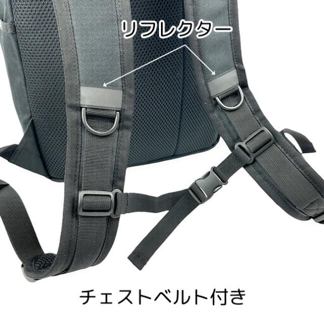 視認性を高めるリフレクター、ずり落ち防止のチェストベルト付き。