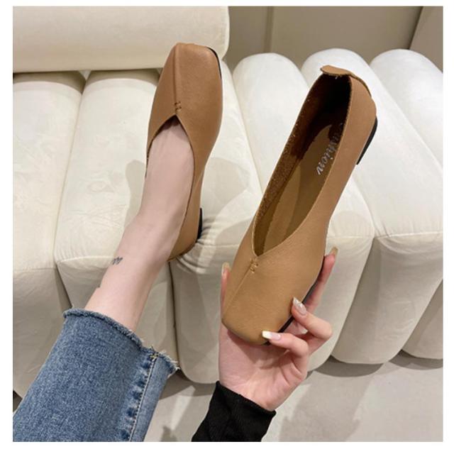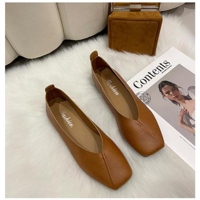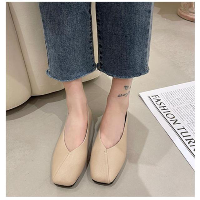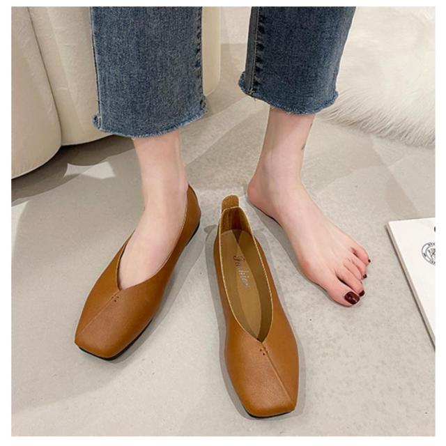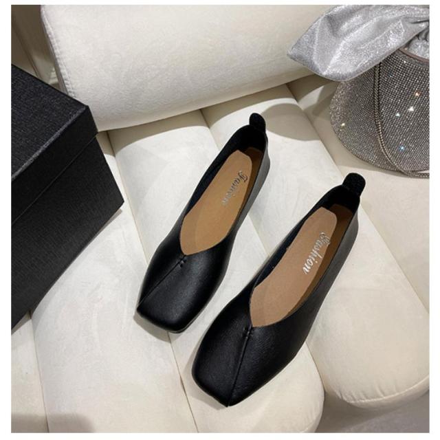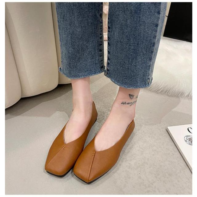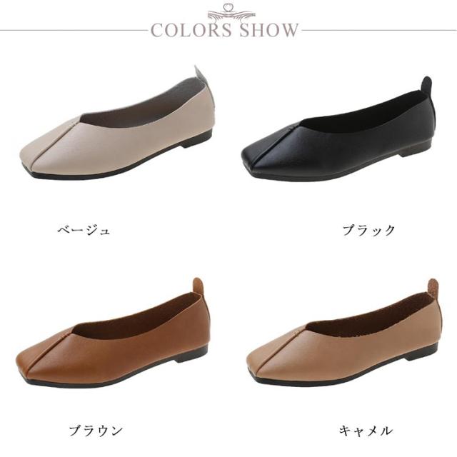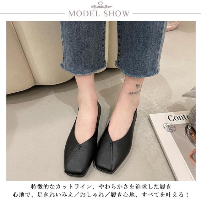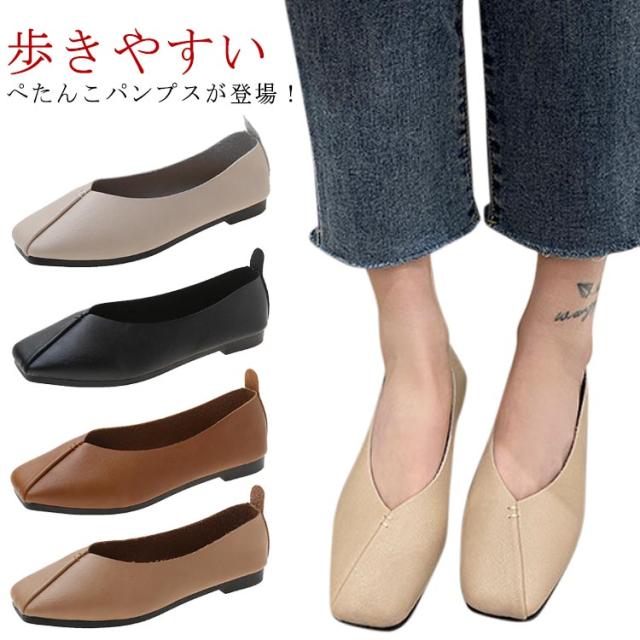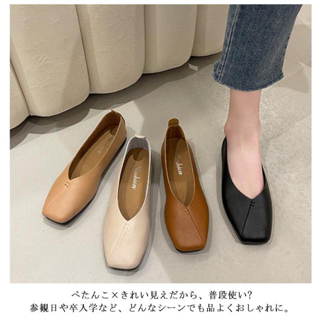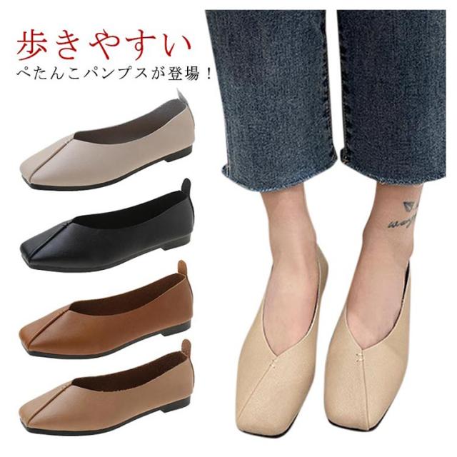 フラットシューズ パンプス 楽 ぺたんこ パンプス 走れる スクエアトゥ レディース Vカット フラットヒール ローヒール カジュアルシューズ 痛くない ぺたんこ靴 ブラック 黒