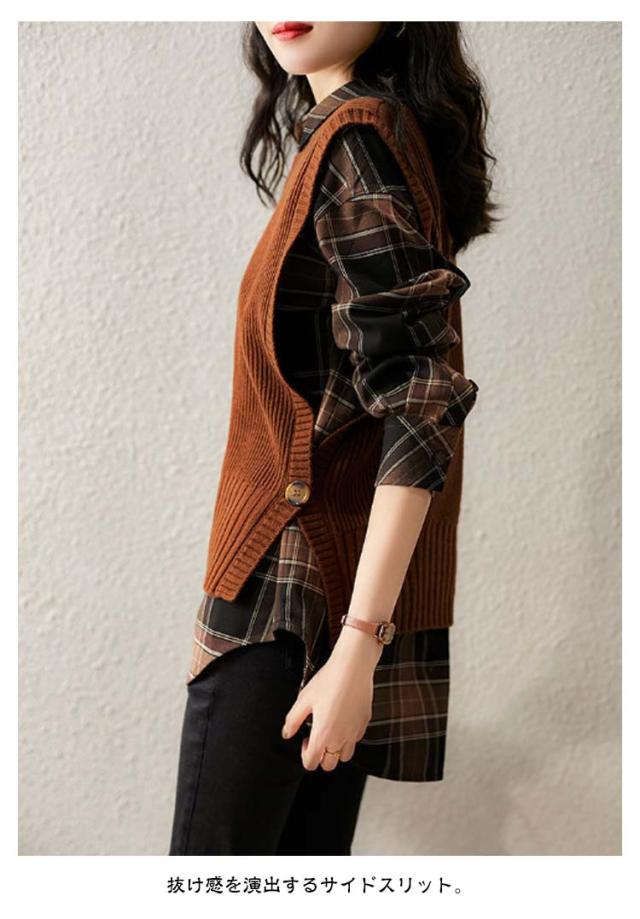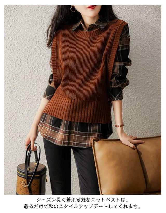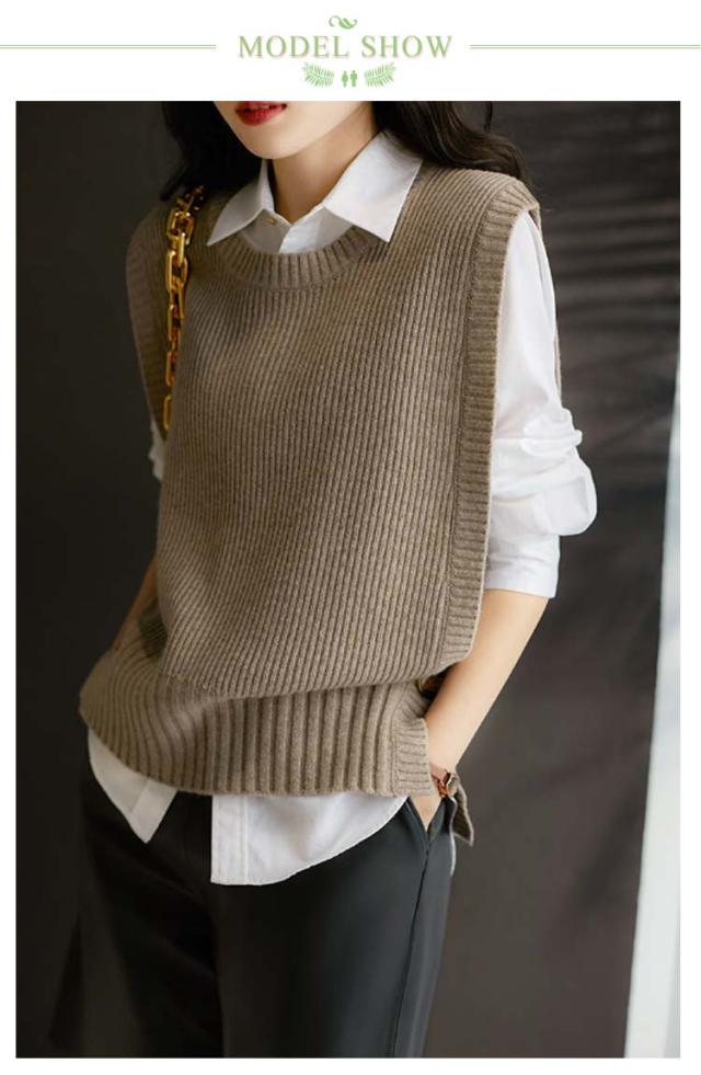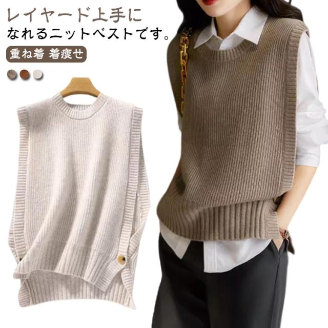 クルーネック 無地 ベスト 大人 ベスト カジュアル トップス ニットベスト ニット レイヤード 秋 冬 30代 40代 レディース ラウンドネック おしゃれ 通勤 セーター スリット