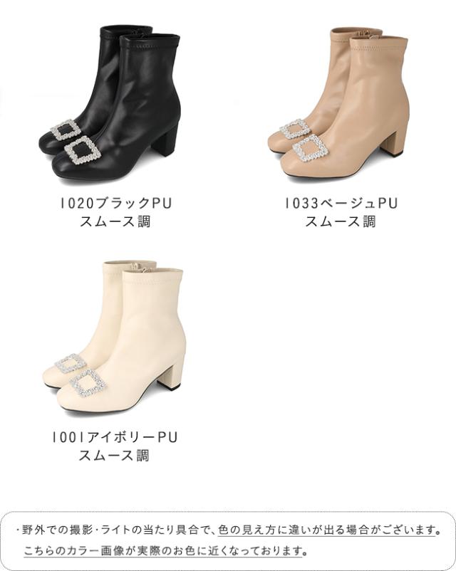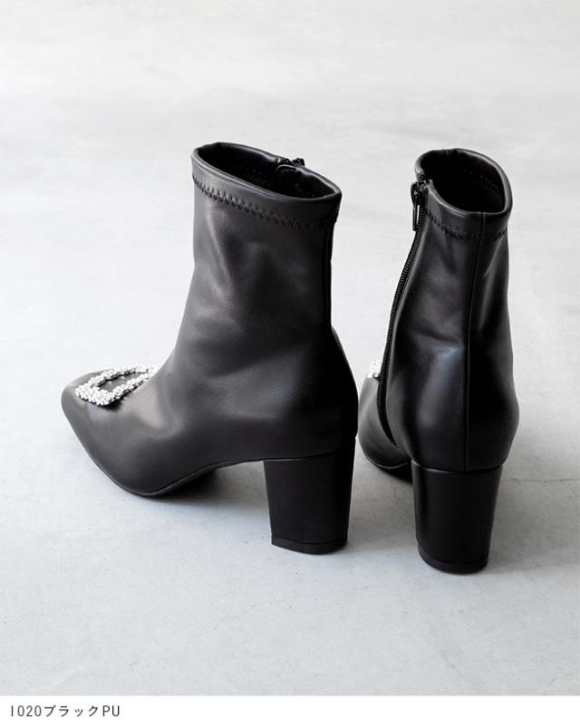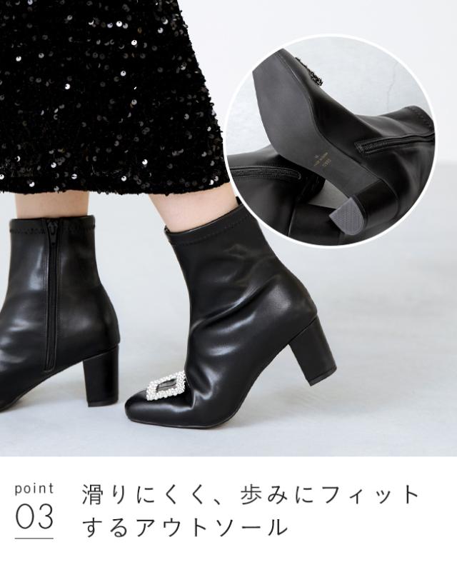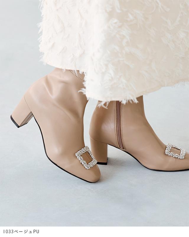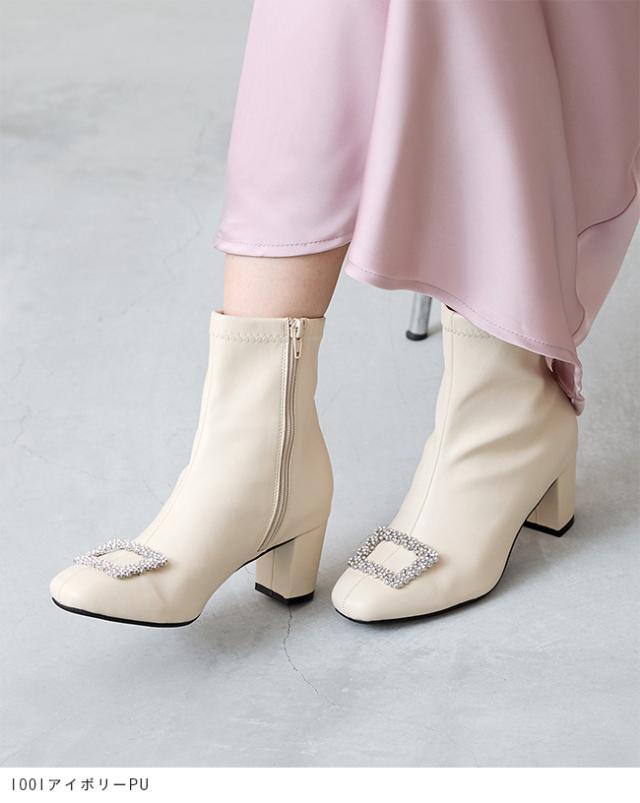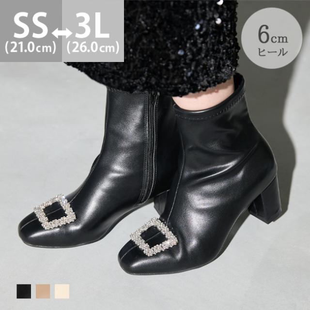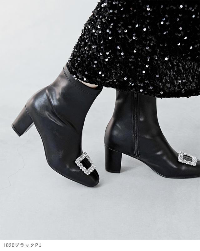 ブーツ ショートブーツ 痛くない レディース 6cmヒール 歩きやすい スクエアトゥ ビジュー モチーフシューズ 送料無料