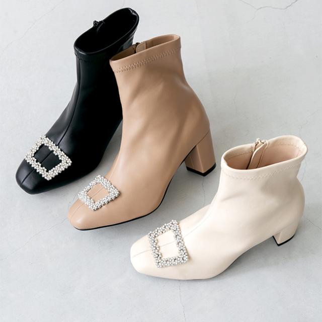 目を惹く大ぶりのビジューモチーフがコーデに花を添えるショートブーツ。
