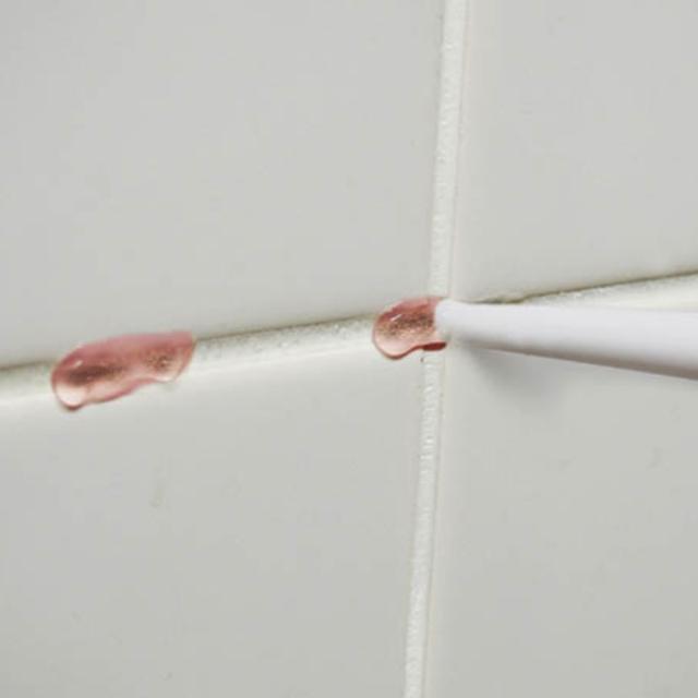 塗ったところが一目瞭然、ピンクのジェルがカビにアタック!