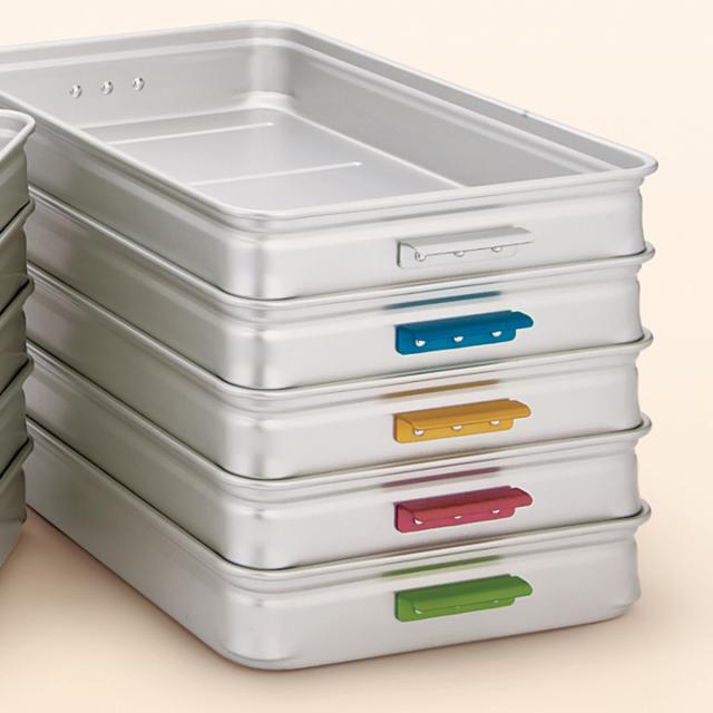 軽くて扱いやすいアルミ製ボックスです。食材の一時置きや保管、調理の下ごしらえ、具材の仕分けなど様々な用途で活躍します。アルミは熱伝導性が良く、冷蔵庫に食材をそのまま入れて素早く冷やすことができます。4色のカラーで用途別に分けて便利にお使いいただけます。
