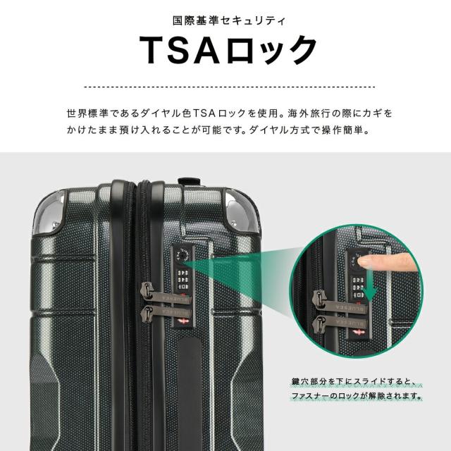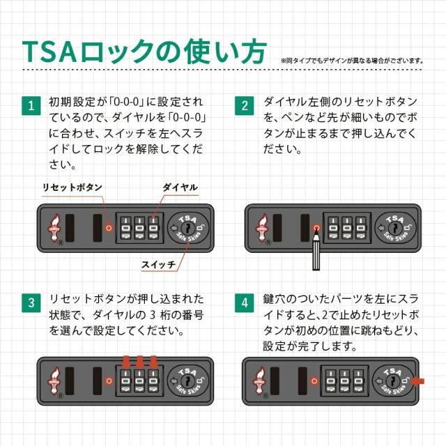 | アメリカ合衆国運輸保安庁(TSA)の認可を受けたダイヤル式ロックシステムを採用しております。セキュリティチェックが最も厳しいアメリカであっても、カギをかけたまま航空会社に預けることができるロック。TSAロックの解錠キーは空港で検査する職員のみに与えられており、抜き打ちのチェックでも鍵を壊される事なく検査が可能なので、高い保安性を誇ります。 ※通常使用時の開錠はお客様が設定した番号で行います。製品に解錠キーは付属しておりません。 |