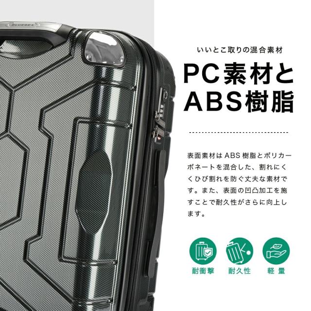 | いいとこ取りの混合素材「ポリカーボネートとABS樹脂」を使用したスーツケース 表面素材は割れにくくてひび割れを防ぐ丈夫な混合素材を使用しています。表面に凹凸加工を施すことで耐久性がさらに向上。 スーツケース側面の丸みを帯びたフォルムは衝撃を受けても凹みにくい設計で、フェイス部分は縦ラインを施した耐久性と高級感あるデザインです。 そのほか 容量を増やせる拡張機能・グリップ機能・マルチ収納ポケット・360°回転静音キャスター・TSAロック等の機能が大きな特徴として挙げられます。 当商品は容量の最大化を意識したアウターフラット型のモデルです。機内持ち込みサイズにつきましては航空会社・飛行機種別によって若干持込ルールは異なります。 |