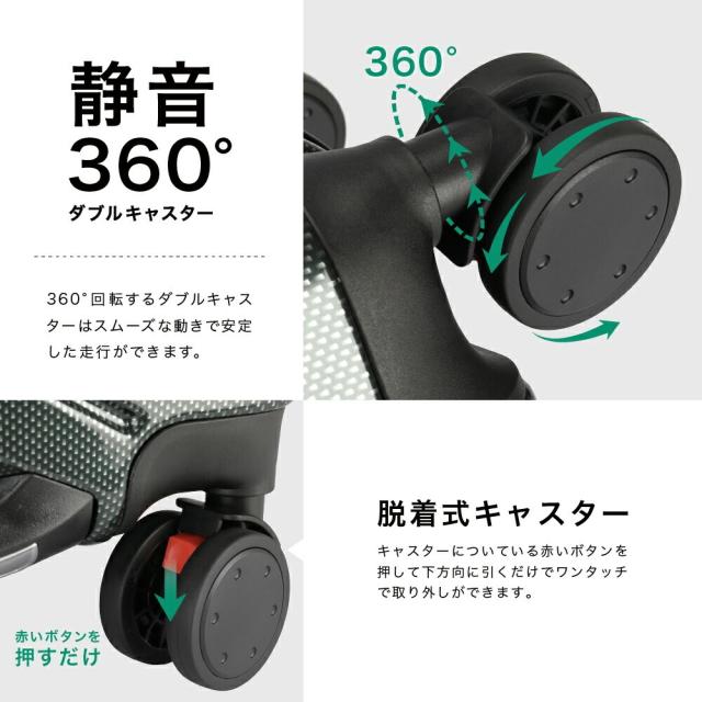 | 1つの足に2つのタイヤがついた、360°回転する静音ダブルキャスター。タイヤそれぞれが独立して動くので非常に高い可動性を誇ります。狭い場所等での方向転換もスムーズに。 荷重が分散されるので、移動中の衝撃吸収力と走行音も低減力に優れ、高い耐久性にも繋がります。 脱着式となっているため赤いボタンを一押しするだけで簡単に取り外せ、コンパクトに収納可能です。キャスター部分の細かな汚れも簡単にお手入れでき、長持ち且つ衛生的に保つことができます。 |