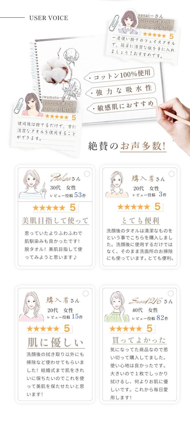 1回の洗顔で1枚のみで十分に拭き取れ、手軽に使えるのが魅力的です。また、使用後の洗濯洗剤や水洗いが不要のため、布マスクと比べてコストの節約ができ、洗剤の排出により環境への負担も軽減されます。天然素材を使用しているため、使用後の自然分解も早く、「肌にも環境にも優しい」ことが実現しています。