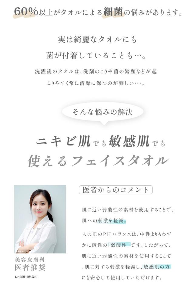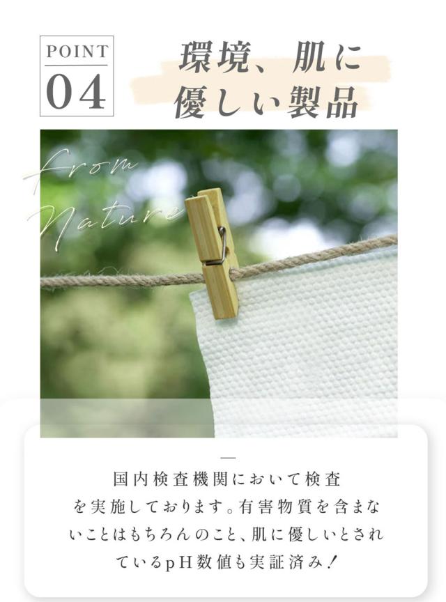 植物由来のパルプから作られたレーヨン素材を採用しており、化学物質・防腐剤・蛍光剤などを使わずに仕上げているため、特にニキビが気になる方や敏感肌の方でも安心してご使用いただけます。