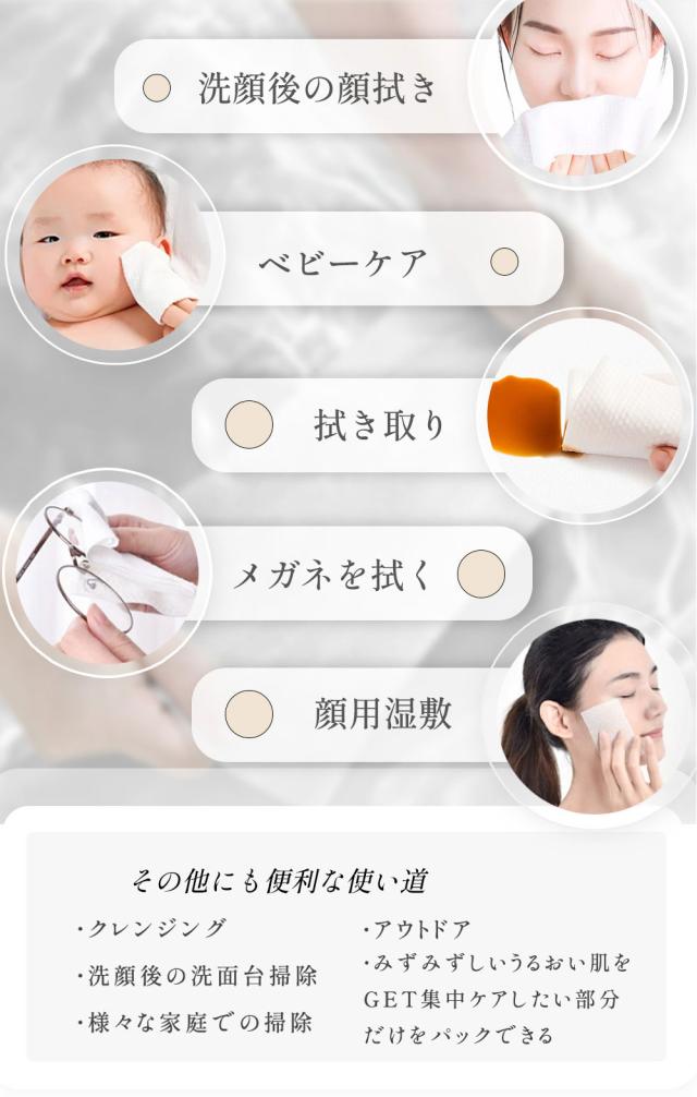 手拭き、メイク落とし、全身清拭、日常の食べこぼしや、掃除にも利用いただけます。