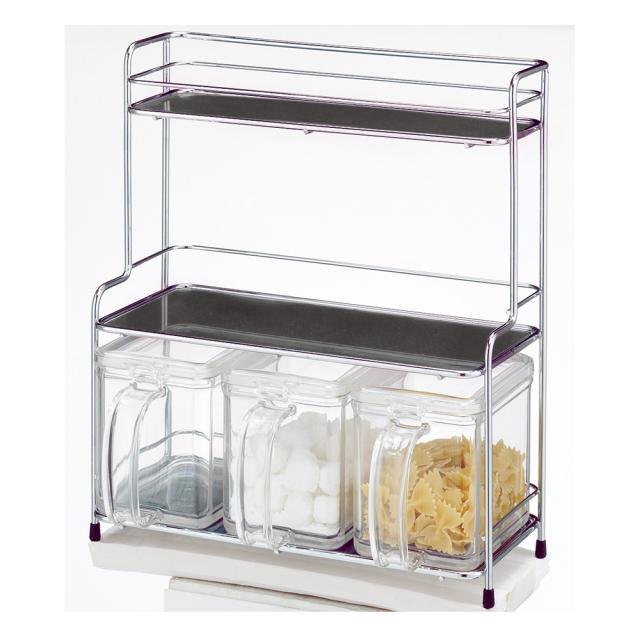 | 商品説明 | ●クリアポットが3個セットになった3段式の調味料ラック。 ■製品サイズ:W295×D170×H330mm ■耐荷重(脚部1段):約2.0kg ■素材: ・ストッカー、フタ:PS ・スプーン:PP ・パッキン:シリコーンゴム ・棚板:AS樹脂 ・フレーム:スチール(クロームメッキ) ・スベリ止め:エラストマー |