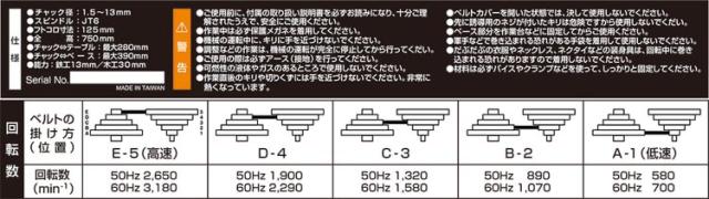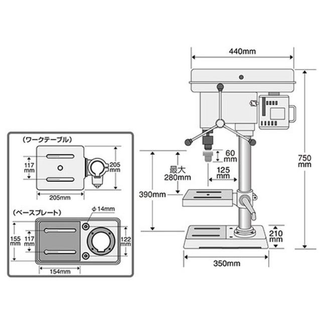 | 電源:単相交流100V(50/60Hz共用)・電流:6.5A・消費電力:600W。回転数:(50Hz)580/890/1320/1900/2650min-1・(60Hz)700/1070/1580/2290/3180min-1。穴あけ能力:鉄工13mm・木工30mm。キリの最大送り幅:60mm・フトコロ寸法:125mm。チャックテーブル間:280mm・チャックベース間:390mm。テーブル作業面:205×205mm・テーブル上下移動距離:280mm・ベース作業面:155×154mm。組み立て時サイズ:全高約750mm。ドリルチャック:1.5〜13mm・深さストッパーゲージ付。 |