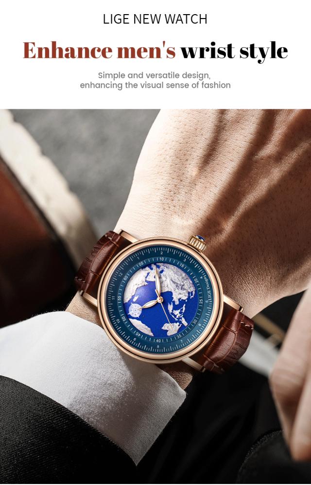 Lige-レザーストラップ付きメンズクォーツ時計,高級ブランドのメンズ腕時計,発光,日付,週,ビジネスクロック