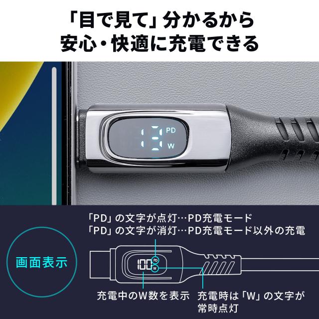 USB Type-Cケーブル USB PD100W対応 電力表示機能付き 1.5m USB 20Gbps 8K/60Hz対応 シリコンケーブル 充電 データ転送 映像伝送 iPhone 16対応[500-USB087-15]