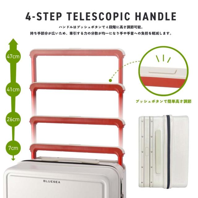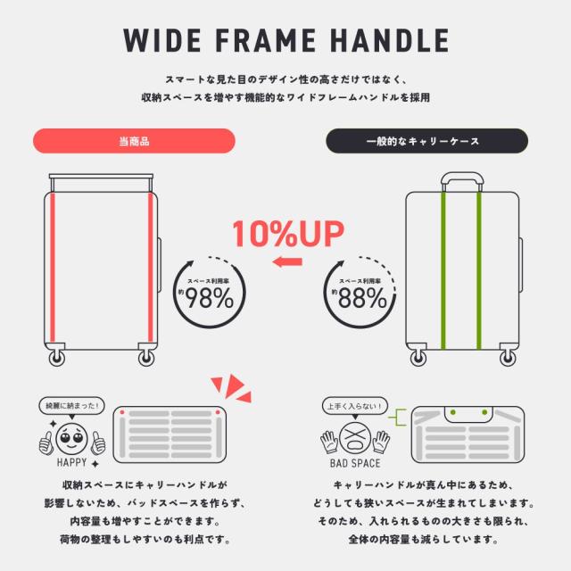 | フレームと一体型のハンドル。見た目の美しい統一感だけでなく、高い耐久性を誇ります。伸縮調整はプッシュボタンでワンタッチ。 枠部分にハンドルが収納されているので、内部容量を最大限活用できる設計となっております。 また、持ちやすいワイドな持ち手部分は、手の負担軽減にもなります。 稼働回数が多いので破損しやすいパーツですが、少しでも長くお使い頂けるようパーツを厳選しました。 |