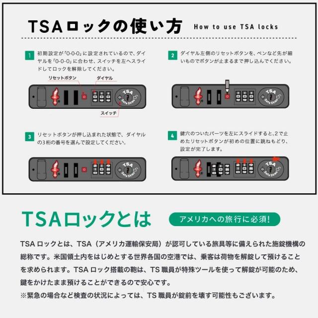 | アメリカ運輸保安局(TSA)の認可を受けたダイヤル式ロックシステムを採用しております。セキュリティチェックが最も厳しいアメリカであっても、カギをかけたまま航空会社に預けることができるロック。抜き打ちのチェックでも鍵を壊される事なく検査が可能なので、高い保安性を誇ります。 ※TSAロックの鍵は空港で検査する職員のみに与えられており、製品に差込キーは付属しておりません。通常使用時の開錠はお客様が設定した番号で行います。 |