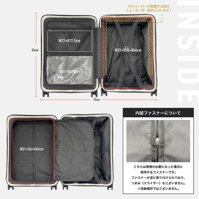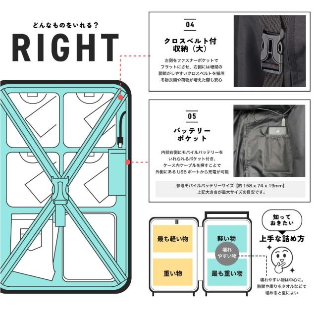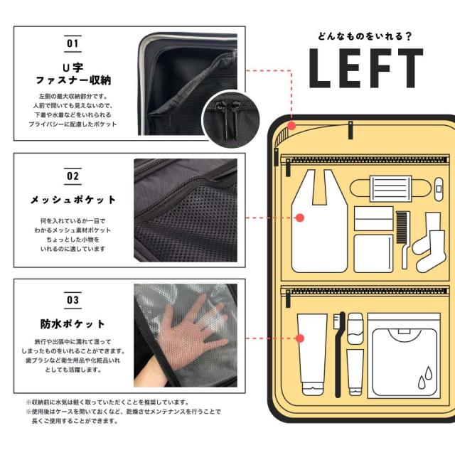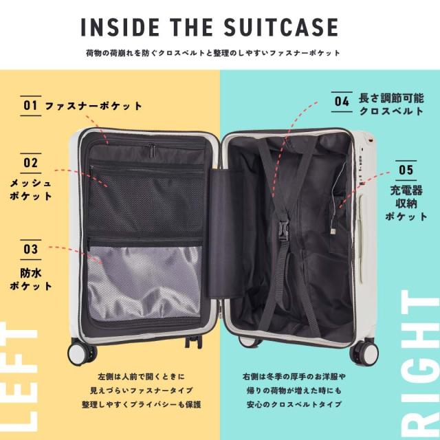 | 荷物が簡単に取り出せるファスナータイプのスーツケース。スーツケース全体を開かなくても、ファスナーで少し開けた口から中の荷物を取り出す事ができます。フレームタイプと比べて金属部分が少ないので、軽量である事も特徴のひとつです。 ハンドルがフレームタイプなので内部に余計なギミックが無く、高い収納力で整理がしやすい仕様となっております。内部には荷物の固定をイージーにする、クロスベルトを装備しております。 メイン収納内部の仕分けポケットには、ちょっと濡れたものを入れても浸食しない防水ポケットと、通気性の高いメッシュポケットがございます。また、ボディ側面にはフックを装備しております。横置きした時に接地するグライド(底足)部分をフック形状にすることで、ちょっとした荷物を引っかけられる便利仕様です。 ロック部分横にUSBの充電ポートを装備しております。内部にモバイルバッテリーを装備する事で給電が可能です。※モバイルバッテリーは付属いたしません。 |