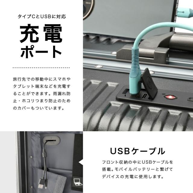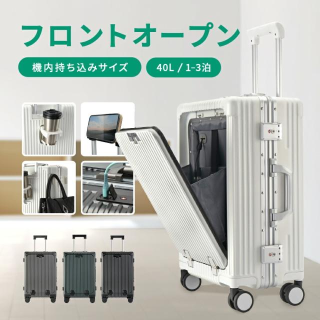 キャリーケース フロントオープン スーツケース キャリーバッグ 多機能 前開き USB 充電 TSAロック ドリンクホルダー 軽量 静音 パソコン USBポート ポリカーボネート100% カップホルダー 荷物掛け 耐久 頑丈 キャスター 40L 国内 海外 旅行 出張 メンズ レディース