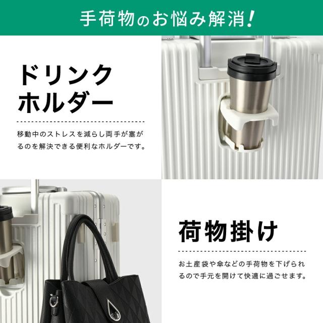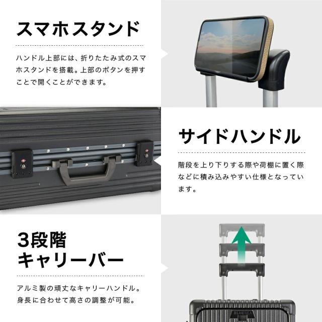 | スマホスタンド機能のついた、3段階伸縮のキャリーハンドル。 電車や飛行機などの移動中の動画視聴の際に、両手が開放されるのでリラックスできます。 キャリーハンドルのポール部分をはやや角型に設計する事で、円柱形状のものと比較して遊びが少ないのでブレにくく、折れにくい仕様となっております。 軽いアルミと堅いスチールの良いとこどり。支柱部分を軽量なアルミで、支柱収納部分を堅牢なスチールで作ったハンドルです。 稼働回数が多いので破損しやすいパーツですが、少しでも長くお使い頂けるようパーツを厳選しました。 |