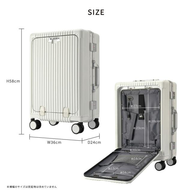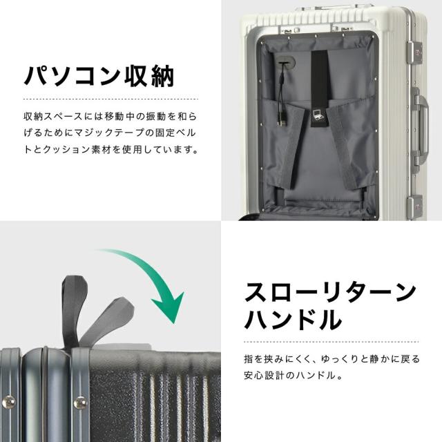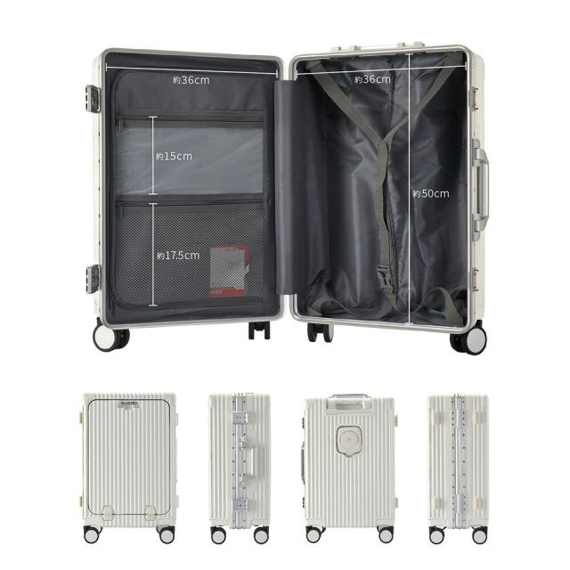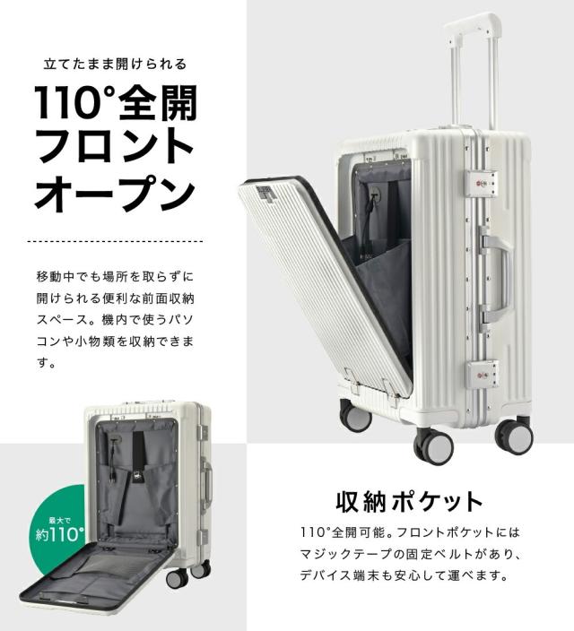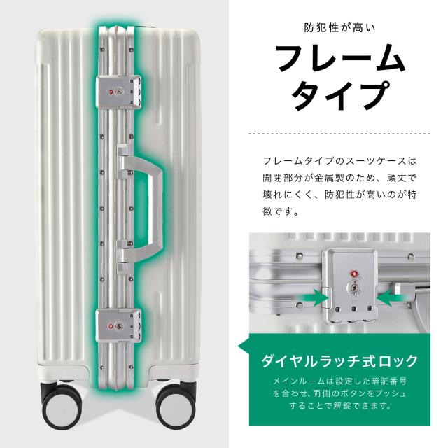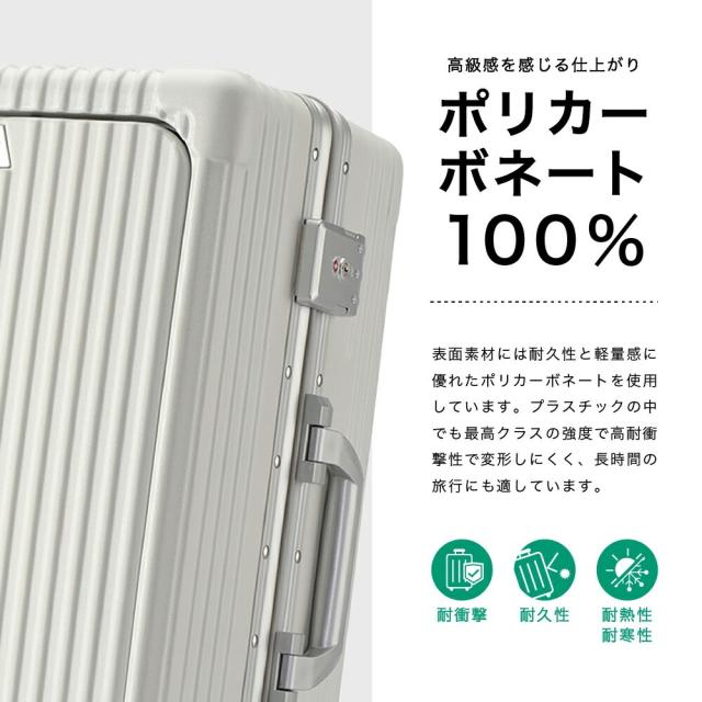 | 高級感あふれる、ポリカーボネート100%素材の高耐久スーツケース。 ・最大約110°開くフロントオープン・トリプルロック(全てTSA対応)・フレームタイプ・ドリンクホルダー ・マルチ収納ポケット ・USB充電ポート ・スマホスタンド付3段階伸縮ハンドル(スクウェアポール) ・360°回転静音キャスター 等の機能が大きな特徴として挙げられます。 メイン外装はポリカーボネート100%。ハンマーで叩いても砕けにくく、火をつけても燃え広がらない自己消化性を持つことから警察や軍隊で使用するヘルメットや防弾材料に使用されることもあります。 エンジニアリングプラスチック素材において最も耐衝撃性に優れておりプラスチックの中でも最高クラスの素材です。 フレーム部分には軽量で頑丈なアルミニウムを使用しています。スチール素材と比較して高額ですが非常に軽いので、総重量の低減が大きなメリットです。また中身をしっかり守り頑丈な見た目から、盗難の抑止力になり防犯性にも優れています。 マット加工を施した高級感のある見た目で、美しい外観を長く保ちます。 当商品は容量の最大化を意識したアウターフラット型のモデルです。機内持ち込みサイズで設計しております。※航空会社・飛行機種別によって若干持込ルールは異なります。 |