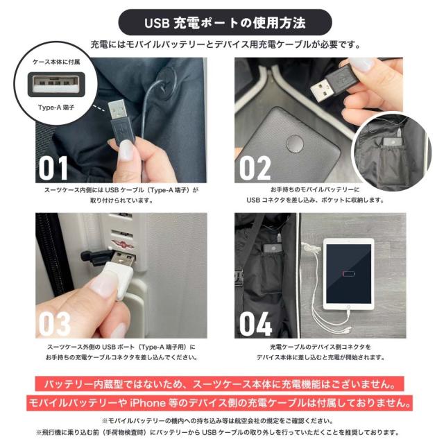 | 移動中でも場所を取らずに開けられる前面パネル。最大で約110°開き、内部のマジックテープでセミオープンスタイルにも変更できます。 ナンバーロック式なので、鍵を持ち歩く必要はありません。当然TSAロックに対応しております。 収納部分にはマジックテープの固定ベルトがあり、ノートPCやタブレット等のデバイス端末も安心して持ち運べます。他にも小物収納ポケットが3点ございます。 内部のUSBポートにモバイルバッテリーをセットして、ナンバーロック部分横のUSBポートから給電する事ができます。※モバイルバッテリーは付属しておりません。 |