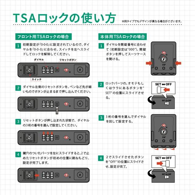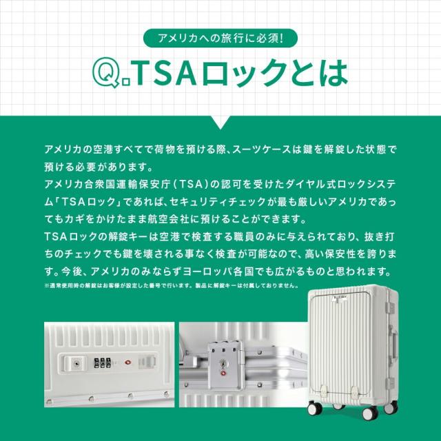 | アメリカ合衆国運輸保安庁(TSA)の認可を受けたダイヤル式ロックシステムを採用しております。セキュリティチェックが最も厳しいアメリカであっても、カギをかけたまま航空会社に預けることができるロック。TSAロックの解除キーは空港で検査する職員のみに与えられており、抜き打ちのチェックでも鍵を壊される事なく検査が可能なので、高い保安性を誇ります。 ※通常使用時の開錠はお客様が設定した番号で行います。製品に解除キーは付属しておりません。 |