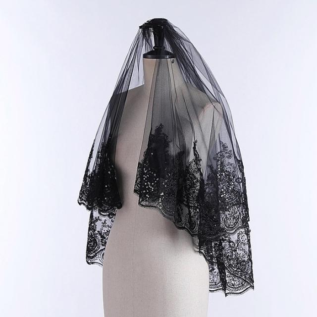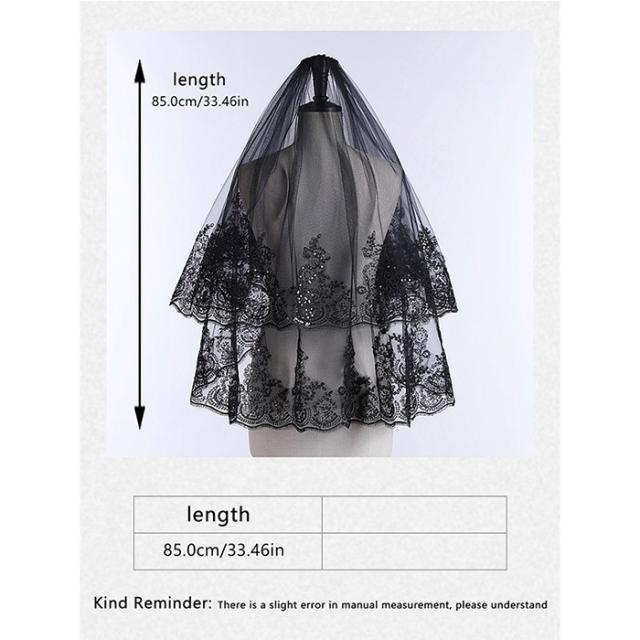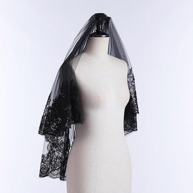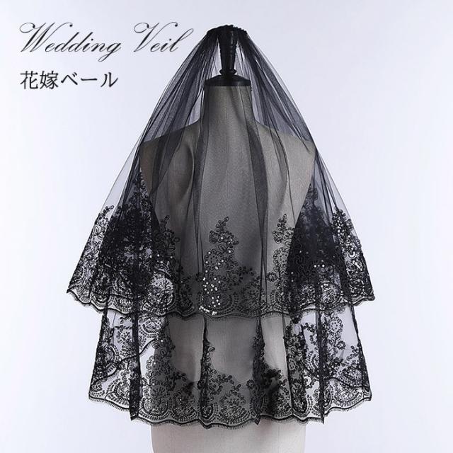 ウエディングベール ブラック 黒 85cm ウェディングベール ゴスロリ ゴシック ロリータ コスプレ 個性的 前サテン 後レース ショート ベール レース 透け感 フェイスアップ ベールダウン