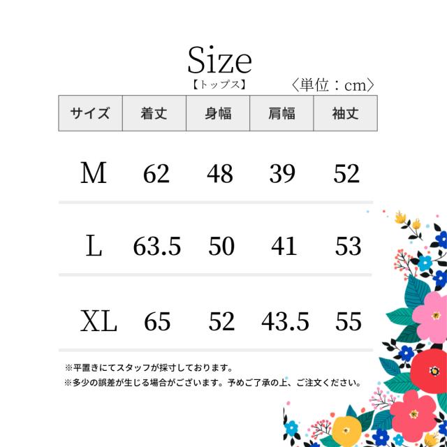すべて平置きサイズです(採寸方法違いより、多少の誤差がございますので、ご了承ください)。