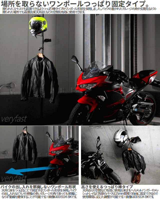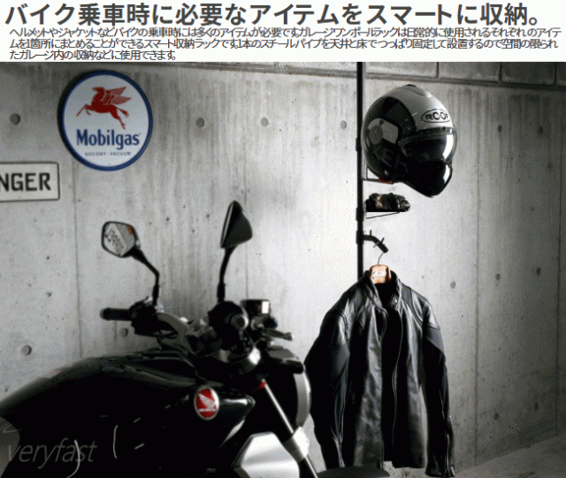 ![]() ガレージ空間を有効利用できるハンガーラック ヘルメットやジャケット、グローブ、カギなど。 バイクに必要なアイテムをスマートに収めるつっぱり棒タイプのワンポールラック。 ![]() ![]() ![]() ![]() ![]() ![]() |