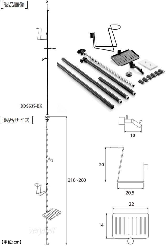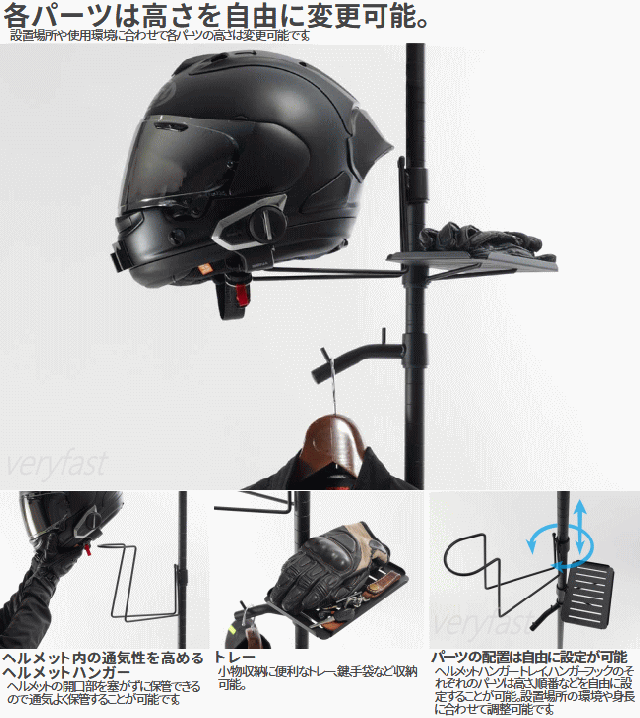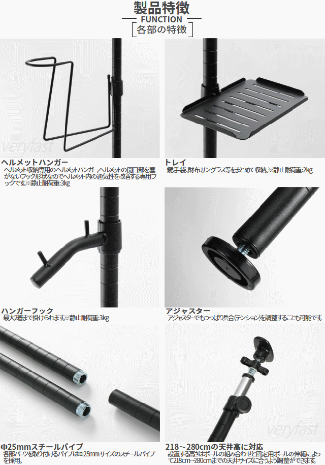 ガレージ空間を有効利用できるハンガーラック。ヘルメットやジャケット等バイクの乗車時には多くのアイテムが必要です。ガレージワンポールラックは日常的に使用されるそれぞれのアイテムを1箇所にまとめる事ができるスマート収納ラック。1本のスチールパイプを天井と床でつっぱり固定して設置するので空間の限られたガレージ内の収納等に使用できます。限られたスペースでも設置できるようつっぱり棒タイプのワンポール形状を採用しました。バイクの置かれたガレージの角や玄関先等の限られた場所でも設置出来、天井近く等の空間を有効に使用できます。設置場所や使用環境に合わせて各パーツの高さは変更可能。■カラー:サンドブラック(ブラック)■サイズW23×L(D)30×H218〜280cm/パイプ径2.5cm■製品総重量(付属品含む)約3.2kg■静止耐荷重[全体]8kg(ヘルメットハンガー3kg/ハンガーフック3kg/トレイ2kg)■材質:スチール、パーティクルボード■組立て推奨人数2人■お客様組立目安時間30分■お客様に別途ご用意頂く必要がある工具:ドライバー、ゴムハンマー■原産国:台湾