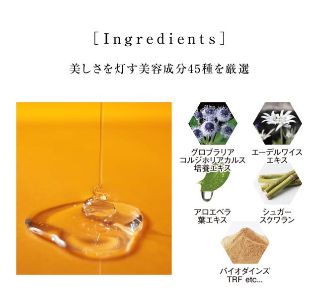 | 全成分 | 水、グリセリン,BG、DPG、プロパンジオール、ベンンチレングリコール、ハチミツ、スクワラン、クリスマムマリチマムカルス培養液、クリスマムマリチマムカルスエキス、ツボクサ葉エキス、エリンギウムマリチムムカルス培養液、セイヨウイラクサ葉エキス、サッカロミセス溶解質エキス、ローヤルゼリーエキス、カンゾウ根エキス、エーデルワイス花/葉エキス、ビオサッカリドガム-1、アルガニアスピノサ核脂、コメ胚芽油、プランクトンエミス、ローズマリー葉エキス、キイチゴ果実エキス、ローマカミツレ花エキス、アロエベラ葉エキス、アロエベラ葉エキス、ニンジン根エキス、ビルベリー葉エキス、ビルベリー果実エキス、サトウキビエキス、オレンジ果実エキス、レモン果実エキス、サトウカエデエキッス、コソユソウ芽エキス、トコフェロール、グリコシルトレハロース、ニオイテンジクアオイ油、オニセルビア油、ラベンダー油、ローズマリー葉油、ローマカミツレ花油、イランイラン花油、カニナバラ果実油、センチフォリアバラ花エキス、ダマスクバラ花エキス、テオブロマグランジフロルム種子脂、ホホバ種子脂、ヤシ脂、マカデミア種子油、ワサビノキ種子油、ダイズ油、デカマカデミアナッツ脂肪酸ポリグリセル-10、オリーブ果実油、アーモンド油、アボカド油、マカデミアナッツ脂肪酸エチル、トリ(カプリル酸/カプリン酸)グリセリル、トリエチルヘキサノイン、ジグリセン、加水分解水添デンプン、PEG-60水添ヒマシ油、シクロヘキサシロキサン、水添レシチン、水酸化K、ミリスチン酸ポリグリセリル-10、レシチン、PEG-20ソルビタンココエート、シクロペンタシロキサン、エタノール、リンゴ酸」、ペンテト酸5Na、キサンタンガム、カルボマー、ヒドロキアセトフェノン、フェノキシエタノール |