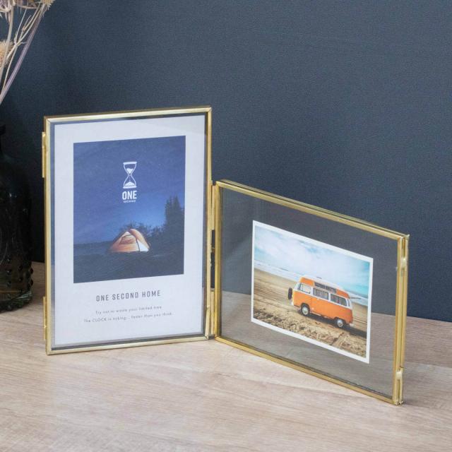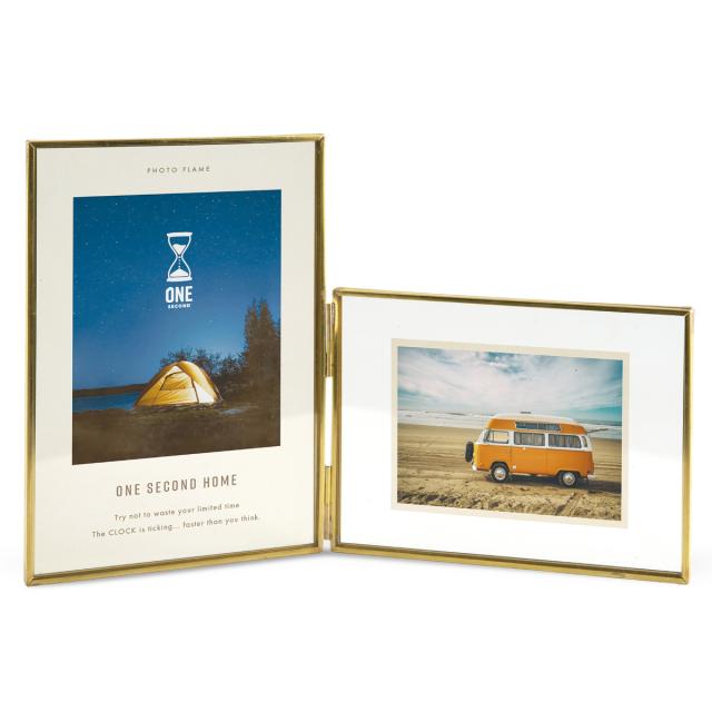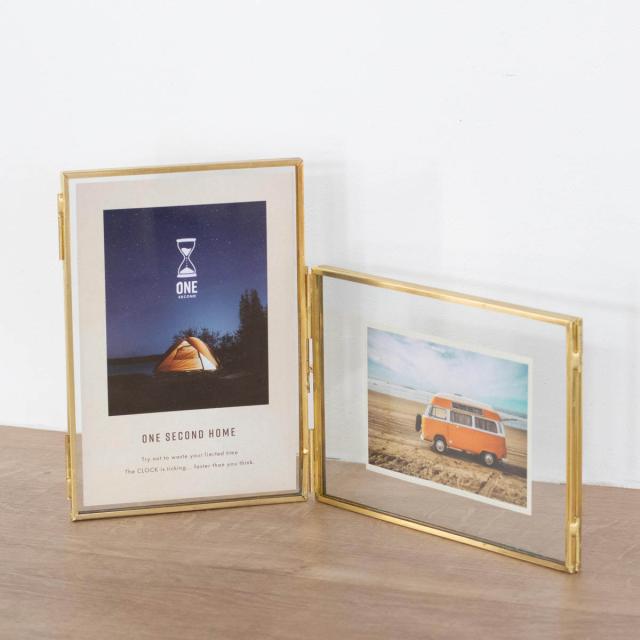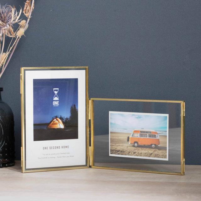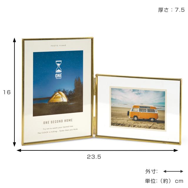 フォトフレーム マルチフェイス メタルフレーム ハガキ判 2連 ( フォトスタンド 2枚 写真立て 写真たて おしゃれ 卓上 壁掛け 置き型 スタンド ガラス 写真 押し花 フレーム ゴールド シンプル ハンドメイド 記念写真 成長記録 )