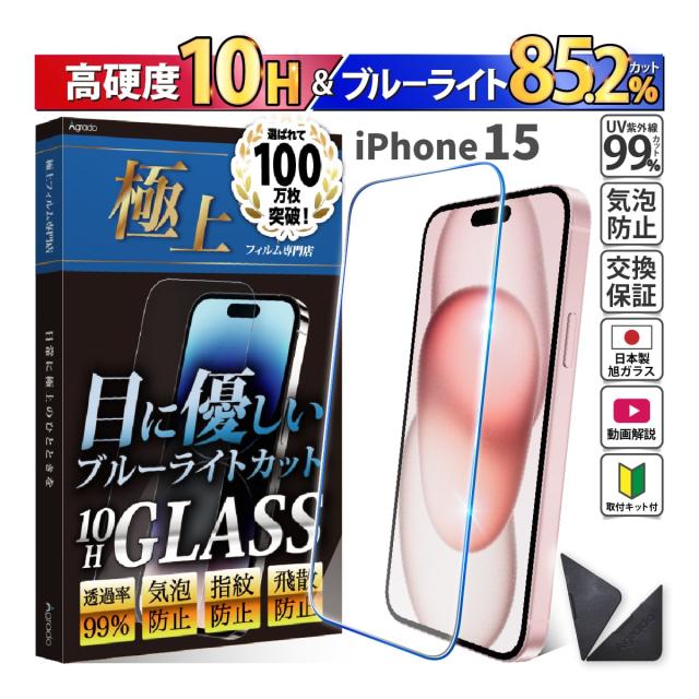 iPhone 15 ガラスフィルム ブルーライトカット かんたん 安心 日本製 透明ガラス 85.2%カット 保護 スマホフィルム 強化ガラス 旭硝子製 保証 アイフォン アイホン おまけ付き 防水ケース ポイント消化 送料無料