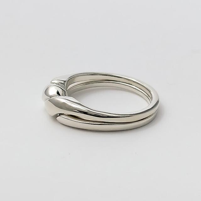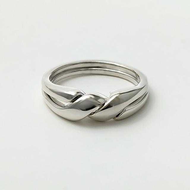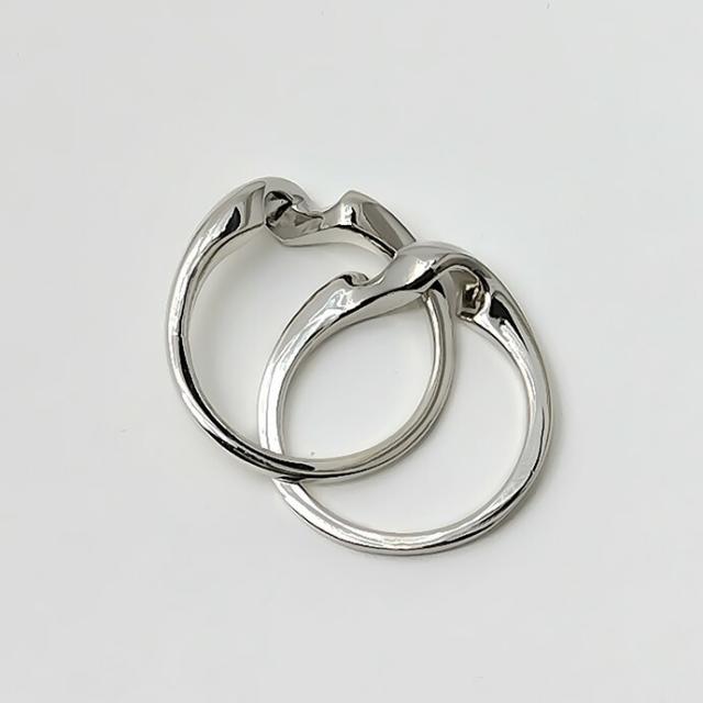 繋がった2つのリングを組み合わせた状態で着ける、パズルリングと呼ばれるタイプのリングです。パズルリングの始まりは15世紀のトルコ、指から外すとバラバラになり中々戻せなかったため、指輪を外して浮気をさせない浮気防止策として、また浮気しないで欲しいという願いを込めて愛する人に贈られました。こちらはバラバラになっても簡単に戻せるため、ファッションアイテムとしてお楽しみ下さい。メッセージリングとしてだけではなく、デザインの良さだけでも十分楽しめるアイテムです。