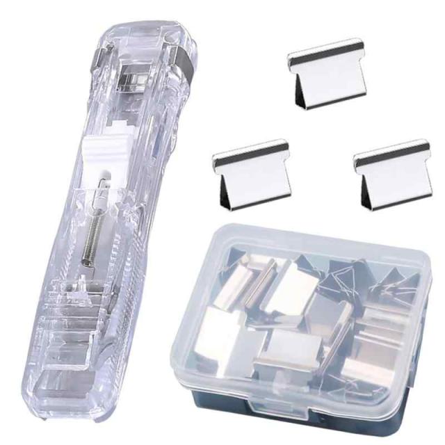 自動クリッププッシャー 1セット 穴をあけないホチキス 透明クリッププッシャー 再利用可能 紙を整理 紙を傷つけない 資料答案用紙の整理 袋の口封じ 使い方は簡単 非破壊製本 事務用品 文房具 クリップ50個