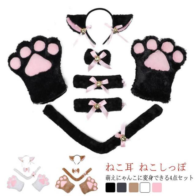 【送料無料】猫耳 コスプレ 仮装 ハロウィン 4点セット 白猫 黒猫 可愛い ネコみみ ねこ手袋 ねこ耳 ふわふわ もこもこ ねこくび飾り ねこリボン にゃんこ メイドアニマル コスチューム イベント衣装 萌え系 ねこしっぽ 肉球 ねこ鈴 ギフト