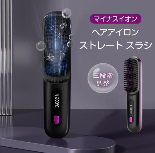 ヘアアイロン ストレート 巻き ヘアアイロンブラシ コードレス 三段階調整 ヒートブラシ USB充電式 携帯用 マイナスイオン くし型 旅行