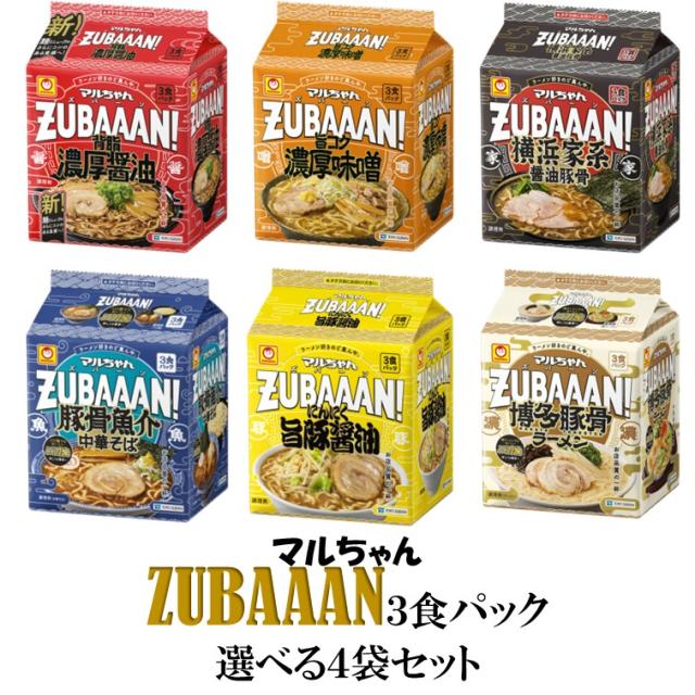 マルちゃん ZUBAAAN!【背脂濃厚醤油】【旨コク濃厚味噌】【にんにく旨豚醤油】【横浜家系醤油豚骨】【豚骨魚介中華そば】【博多豚骨】袋麺3食パック選べる4袋(計12食)