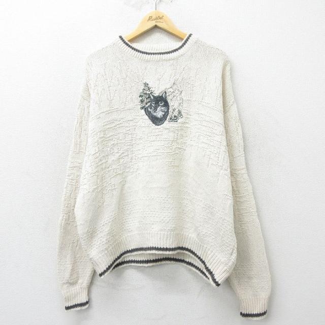 古着 長袖 セーター メンズ 90年代 90s オオカミ 刺繍 大きいサイズ コットン クルーネック USA製 白 ホワイト XLサイズ 中古 中古 古着