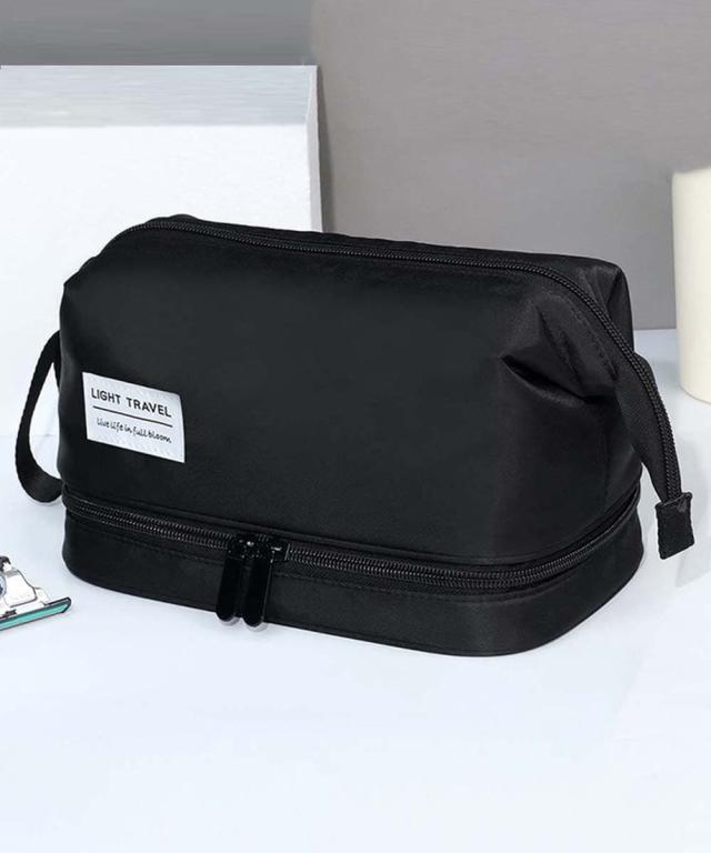 上下二段に分かれ、化粧品と化粧道具を別々に収納できる便利な大容量コスメポーチ