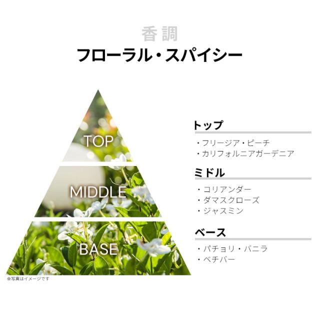 ピーチ、カリフォルニア・ガーデニア、フリージアなどが、ダイナミックなフローラル・スウィートを香り立たせるトップから、
